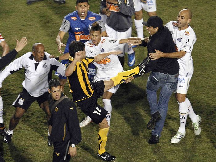 Os jogadores saíram na pancadaria após o fim da decisão da Libertadores. O volante Aguiar, do Peñarol, era um dos mais irritados e alegou ter sido provocado por um torcedor santista que teria invadido o campo.